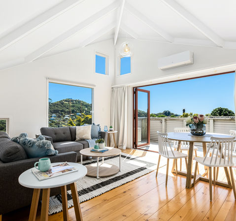 The main dwelling is a cute 2 b/r home with an open plan living area featuring high vaulted ceilings and polished timber floors. Large picture windows & bi fold doors that open out to the deck allow you to drink in the stunning views over the surrounding hills and out to Kapiti Island and beyond. The north facing aspect along with the clever design means the home is absolutely bathed in all day sun, right down to the last rays at sunset yet it's surprisingly private as well. Enjoy a quiet drink at the end of the day or invite friends and family over for a BBQ as you watch the sun going down.